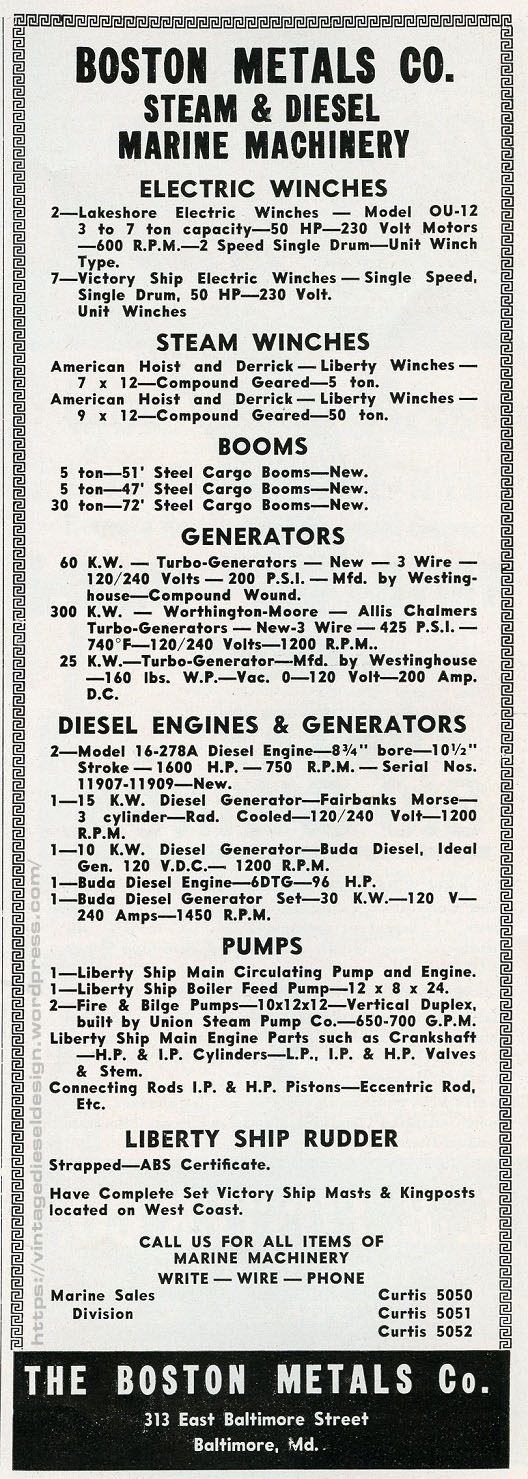 Coincidentally a few weeks ago I was browsing a 1949 issue of Marine News, and came across an ad for Boston Metals Company, advertising a slew of surplus WWII vintage equipment. Boston Metals was a rather prominent ship breaker and scrapped quite a bit of WWII era vessels such as Destroyer Escorts, Landing Crafts of all sizes, Liberty Ships and everything else you can think of.