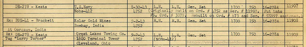 Engines 11907 and 11909 were originally part of Cleveland Diesel order #4752, which covered a vast portion of Destroyer Escorts. These specific engines (and two others) would go into 1943 built DE-278, to be named the “USS Tisdale”. DE-278 was never commissioned in the US and went to Britain as part of WWII Lend-Lease and would be commissioned by the Royal Navy as the “HMS Keats”. She would receive partial credit for sinking German U-Boat U-1172 as well as U-285. After the war, the Royal Navy returned the “HMS Keats” to the US, where she would be sold for scrap in 1946. The other pair of 16-278A’s from the “HMS Keats” would wind up in Norway, in the “MS Rogaland”.