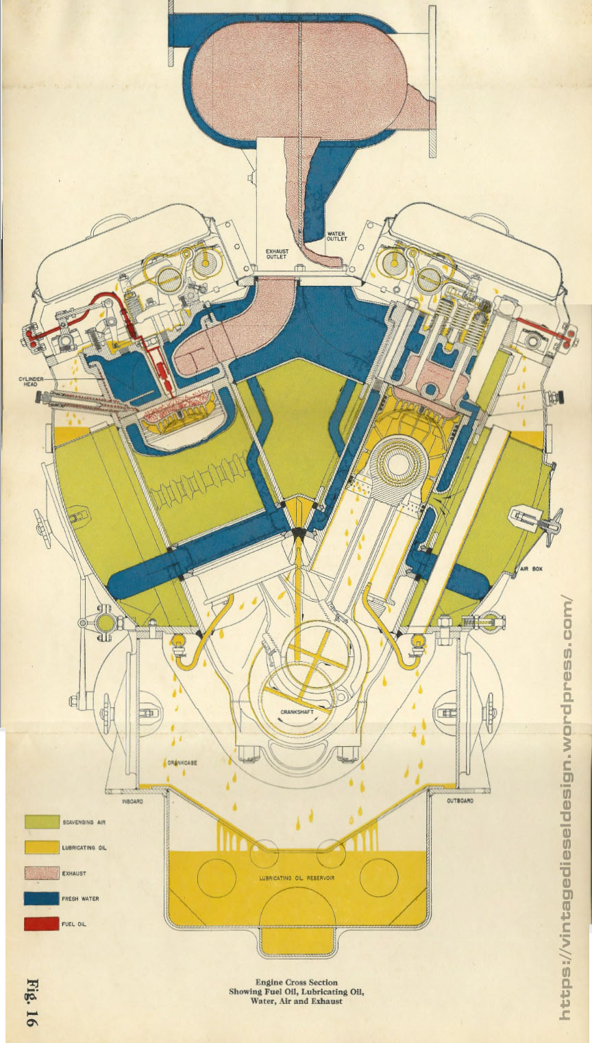 Note the upper deck of the engine in the “U” (cast) or “V” (fabricated) upper portion where the exhaust coming out of the heads would mate up with the upper manifolds. The original EMC 567 design is well outlined in Eugene Kettering’s paper on the History and Development of the 567, which will be linked to at the end of this article.