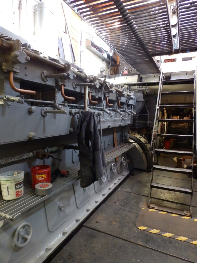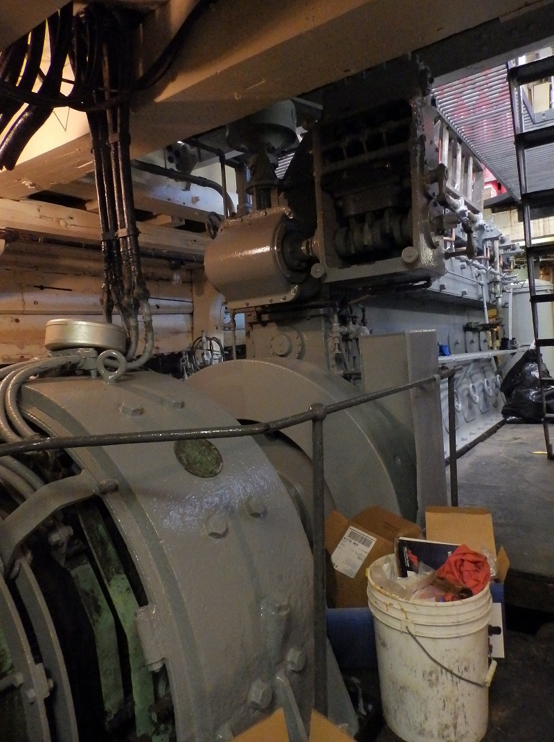 Looking forward at the Port Winton 129. Note the large flywheel, and the GE 213kW generator. Click for larger. Will Van Dorp photo.