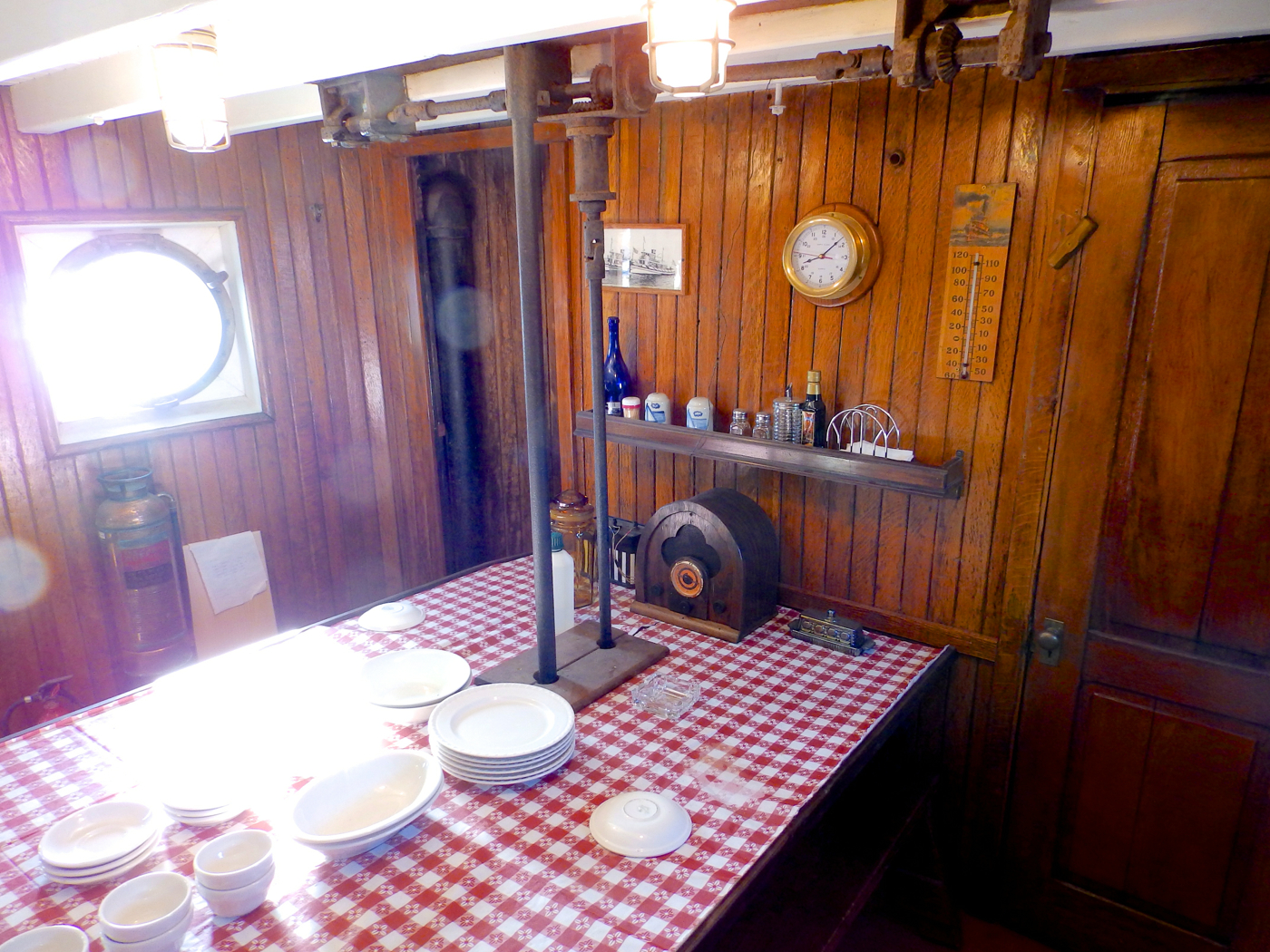 The galley of the Luna, with some gorgeous wood paneled walls, not something you see on tugs today! Note that the shaft for the steering, as well as the duplex propulsion controls (linked together) run right through the galley table! Unfortunately Will was not able to get a photo inside the wheelhouse on his visit. Click for larger. Will Van Dorp photo.