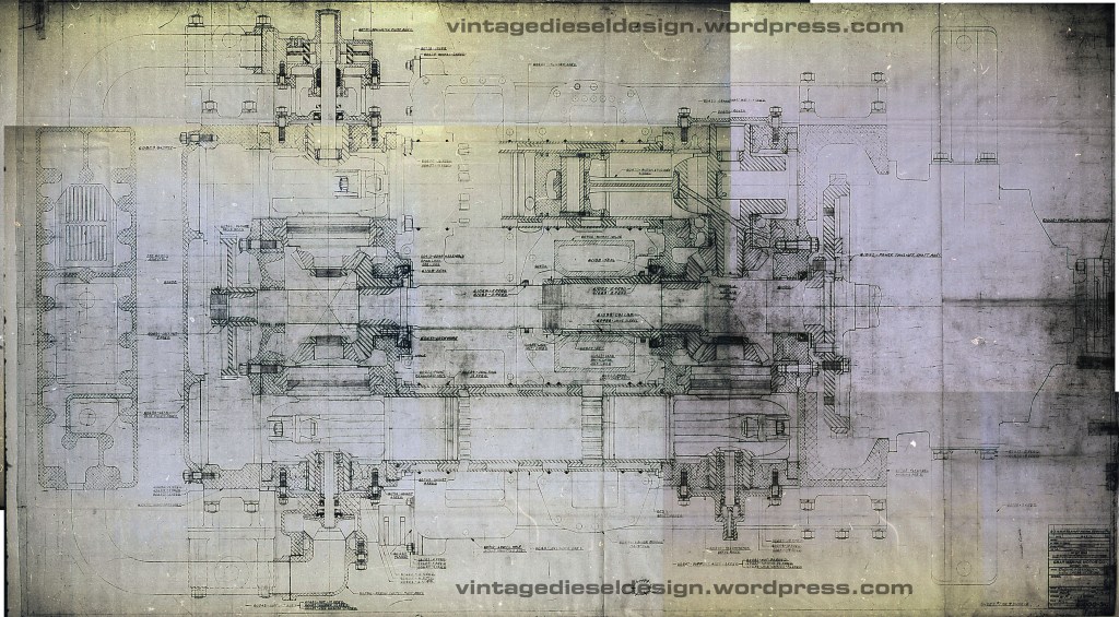 So, just what is the deal with this engine? Well, I have no idea, and I really hope some of the viewers can help with this one. I have never seen an opposed piston engine like this one. Its a 2 cylinder opposed piston, but note that each crankshaft (4 of them!) drives a bevel gear set, which in turn drives the main center shaft. Holy moving parts, Batman, this thing could almost give a Napier Deltic a run for its money. On the back end, is a reverse gear.