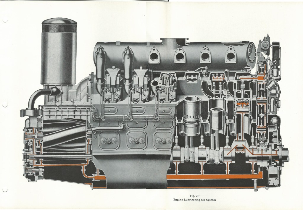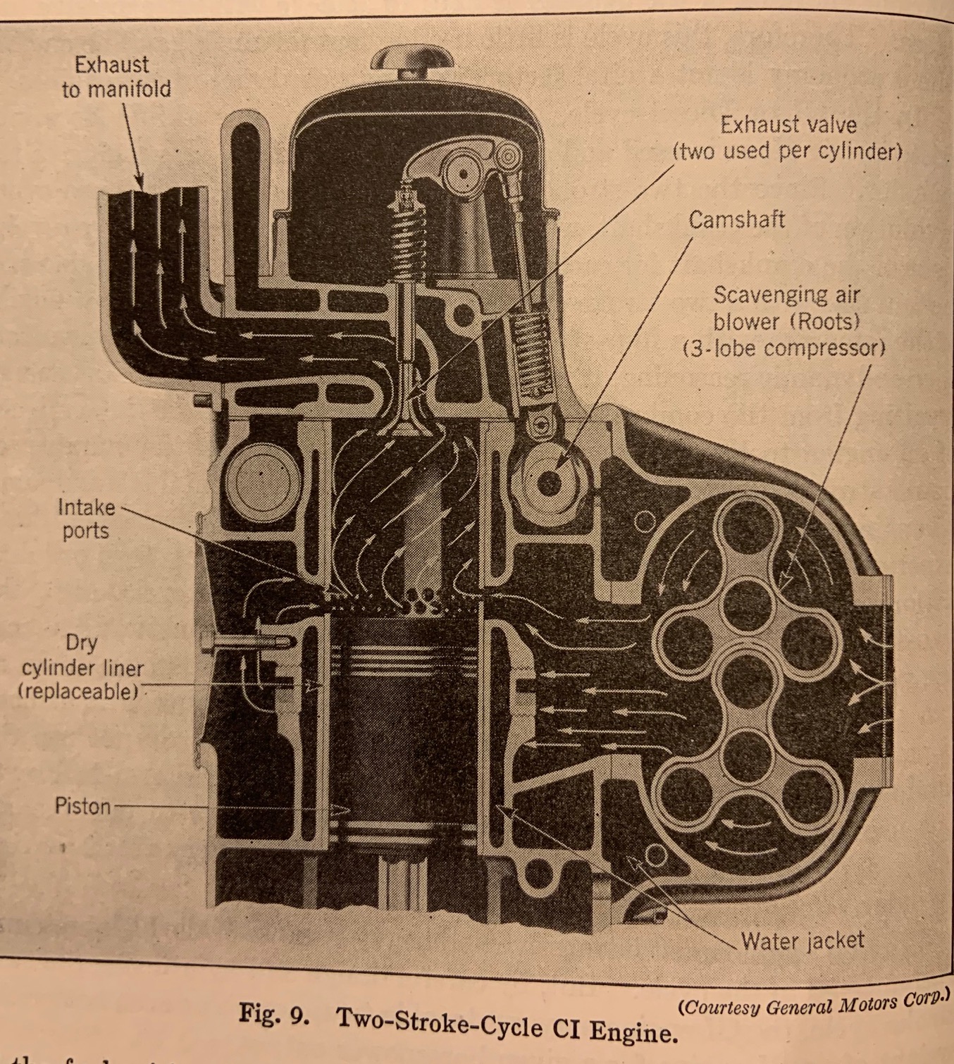 I’d first heard of the “GMC Roots Blower” associated with supercharged dragsters & hot rods. Later, while reading my father’s 1944 textbook “Internal Combustion Engines – Analysis & Practice”, I discovered a cutaway section of the General Motors 2-stoke CI (compression ignition or diesel) engine, below: