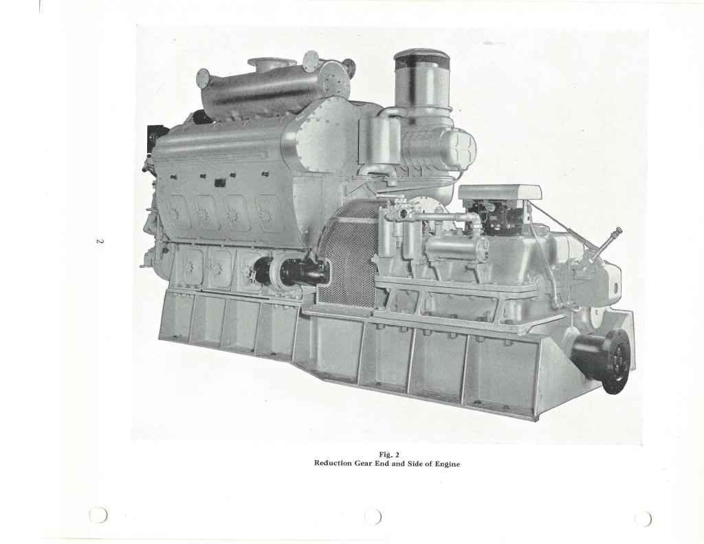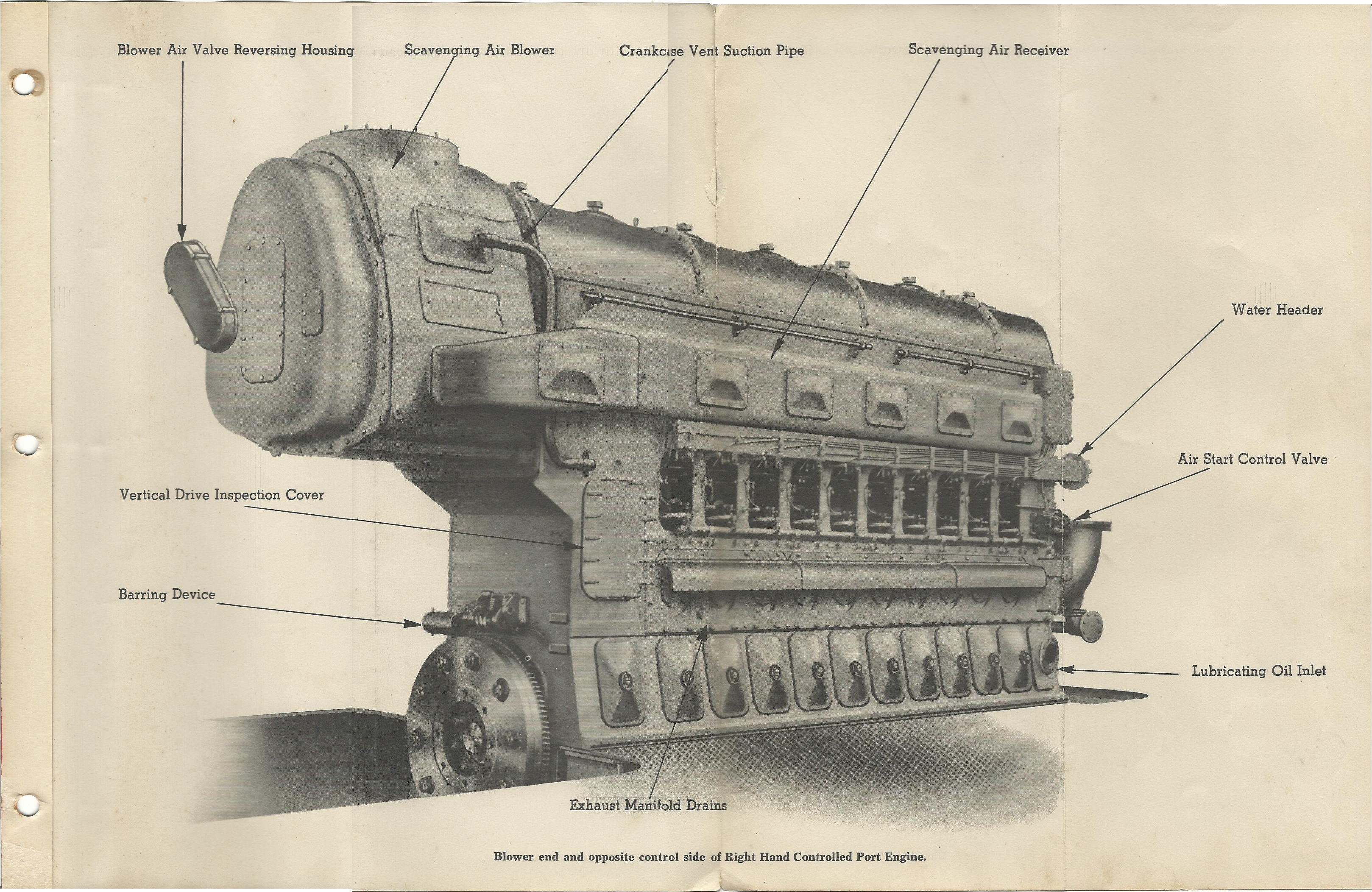 The WWII era FM 38D manual does not use the word “Roots Blower” but instead refers to it as a “Scavenging Air Blower”. The FM 38D blower spins at 1450 rpm and provides 6000 CFM at about 2 to 4 PSI. The Direct Reversing version of this engine used a set of linkage and air valves on the blower in order to direct the air in the proper direction when the engine is running astern, thus the blower is running backwards.