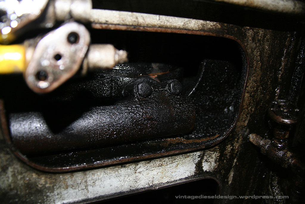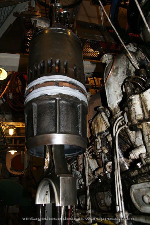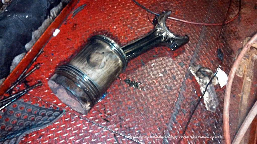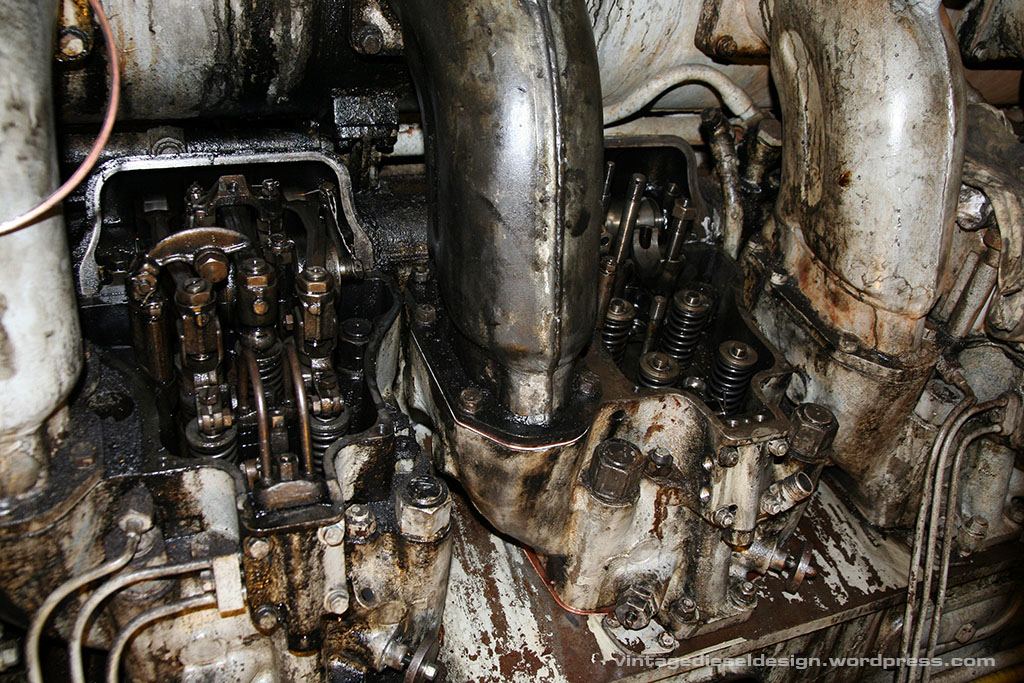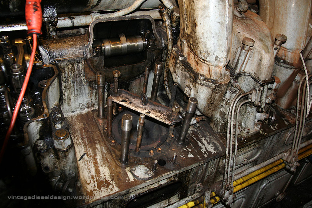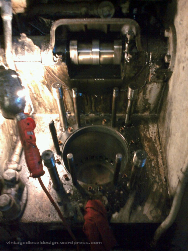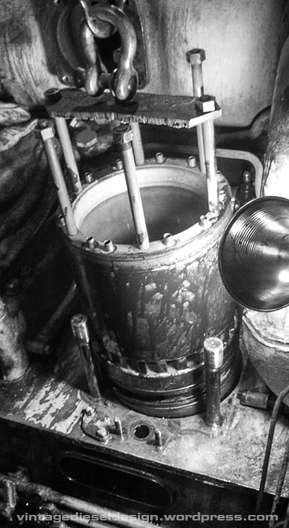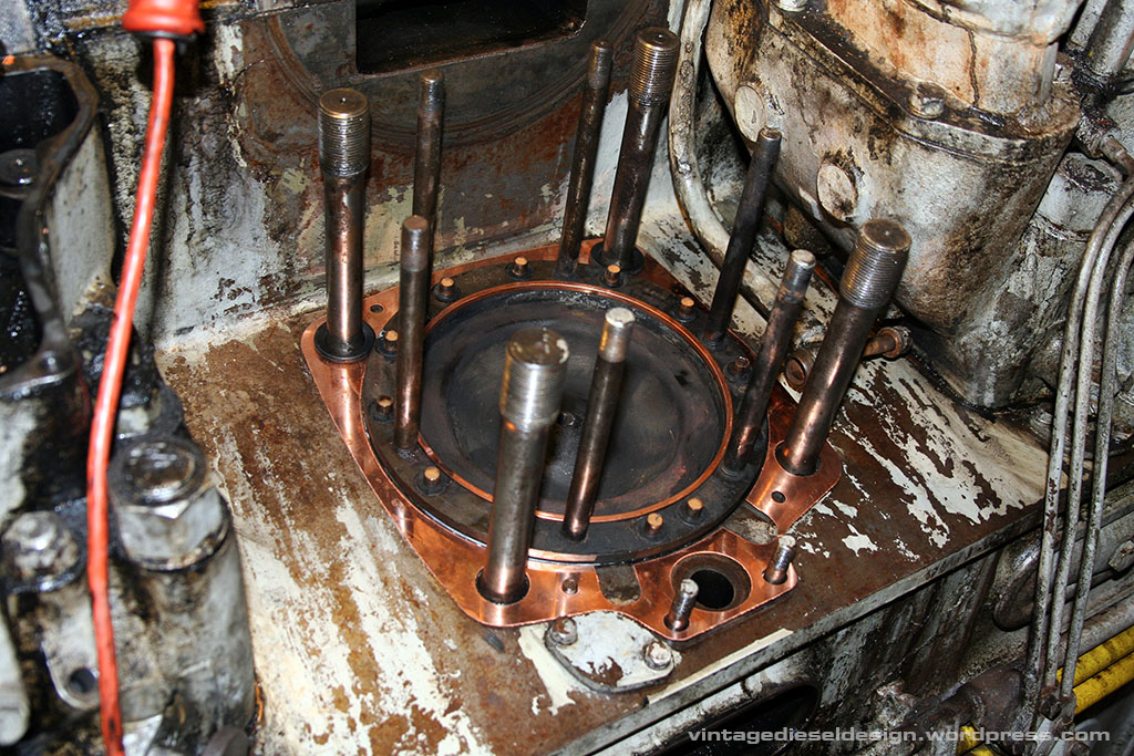 Now we have the head off. Pulling the head is typically the hardest part of the operation, as the stud holes will fill with oil and sludge, as well as carbon – more on that one shortly. Cleveland’s use direct air start, meaning no starter motor. 300PSI (up to 600 was used on the Sub’s) is directly admitted to the head in order of timing in 8 of the heads – that’s what the small line is just above the right most, lower head stud.