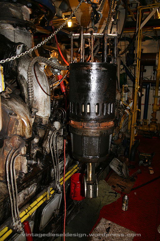 To pull the liner, you need a liner lifting plate (we had to make one, we now have an OEM one..). The piston crown has a small tapped hole for an eyebolt, thus you can secure the piston to the plate, and lift them out as one assembly.