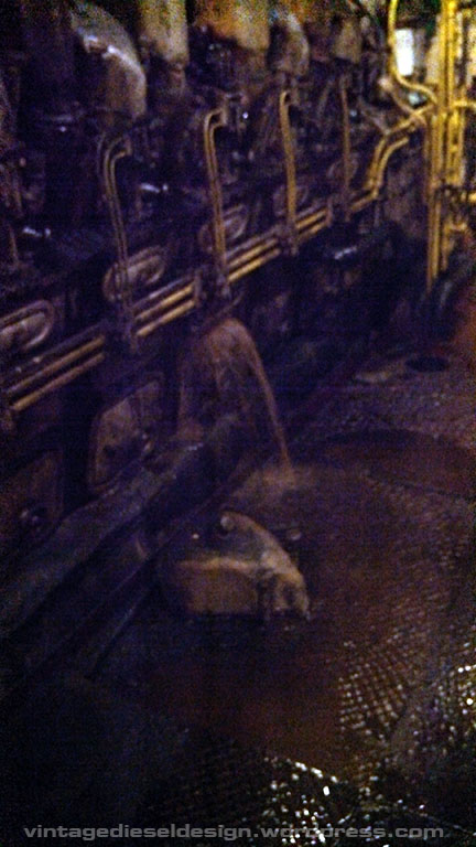 Looking down through the airbox, you can see the water deck area. Water enters through the water manifold that runs through the airbox into the liner. The EMD 567C and Cleveland 498 engine simply used a bolted on extension from the manifold pipe directly to the liner, eliminating these O rings. These O ring seats can actually be changed, but it is an enormous project. You can see here how Cleveland’s have individual connecting rods on each connecting rod journal.
