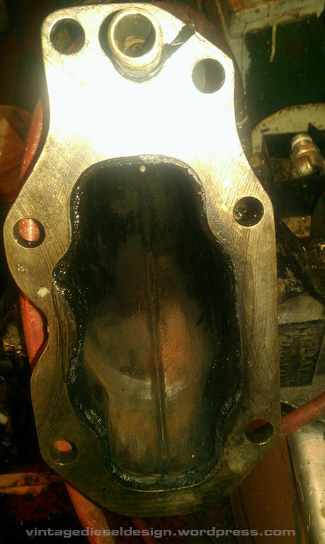Bottom of the head. Nothing special here. The left is toward the center of the engine. The large hole to the right is where the injector control rods goes into the head.