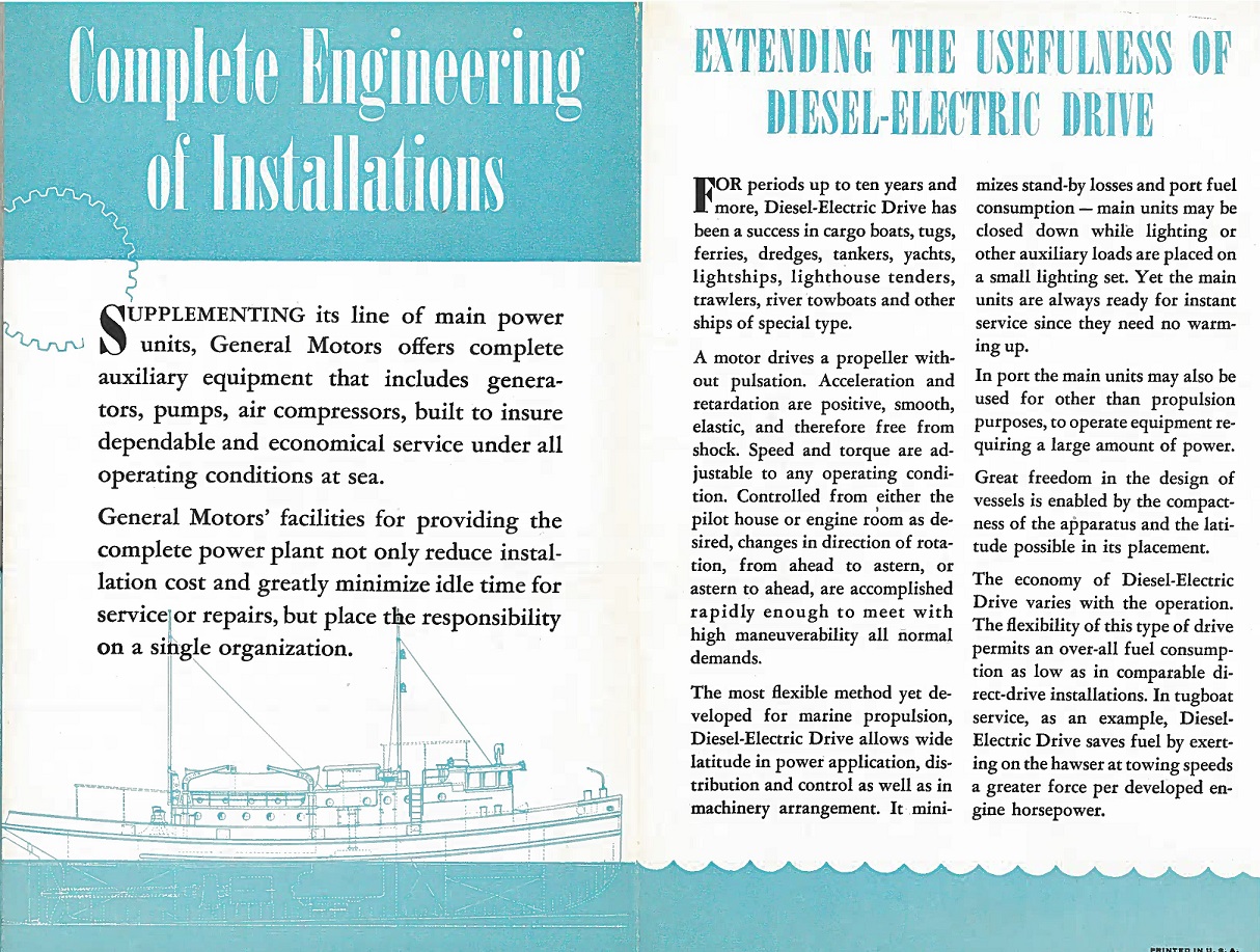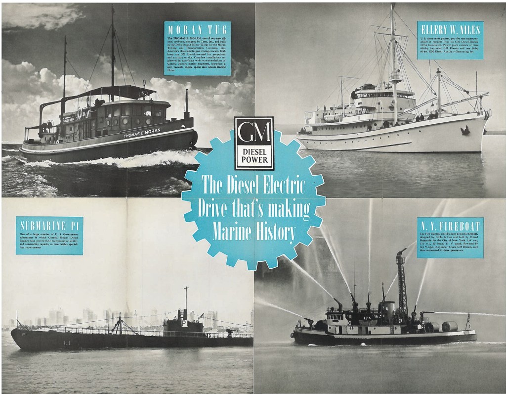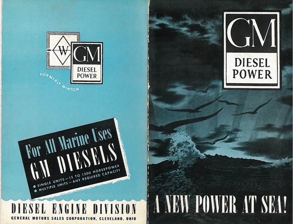The tugs would mark another milestone – breaking Tam’s, Inc. into the world of tugboats. While I do not know if they were the very first ones, they would be the ones that really set the pace. Tam’s was well versed in yacht design, as well as being a broker and insurance company. Working with Winton on yacht design would start the relationship with GM as well, being that GM now owned Winton. Beginning in 1938, and lasting for only about a year, General Motors marketed all three engine divisions (Winton {soon to become Cleveland}, EMC and Detroit) under the single “General Motors Diesel Engine Division”, even though the three companies were still operating individually.
