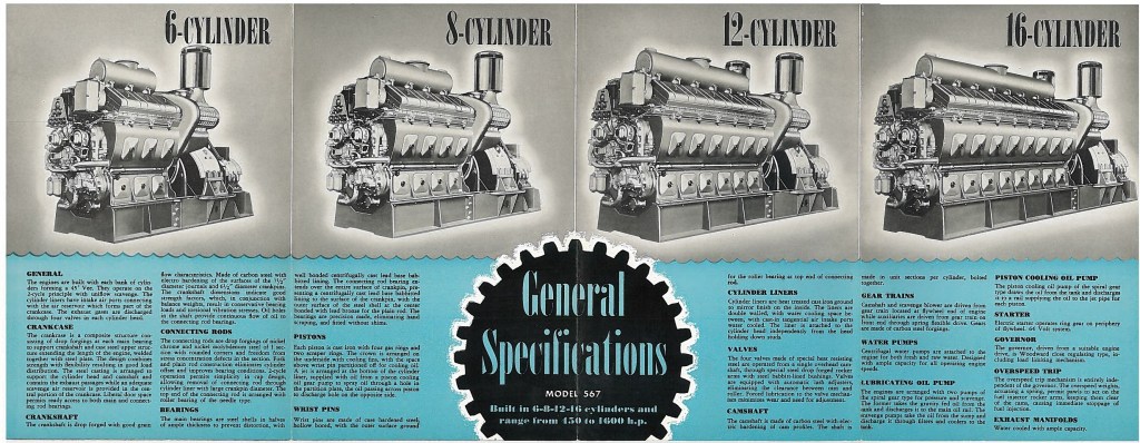 I was first introduced to the Thomas & William in detail when my partner in Cleveland research Jay Boggess showed me a scan of a GM booklet he had: “A New Conception of Diesel-Electric Drive”, which featured the two tugs in depth. Designed under Richard Cook at Tam’s, the tugs were 94′ 4 1/2″ long, with a 25′ beam. The all welded tugs were built in Bay City, Michigan at Defoe Boat & Motor Works. Diesel-Electric drive was not a new concept by any means, however using it with newer, medium speed engines was. Electro-Motive developed the new 567 engine in 1937 for railroad use, having learned from the lessons of the Winton 201A. However, interestingly enough, the first production 567 engines would be used in the Thomas and William, as quoted in EMD’s WWII era book “Diesel War Power”. The tugs used a pair of V8 567 engines, rated at 660HP at 750RPM each.