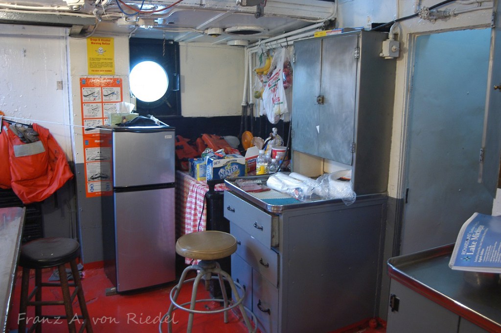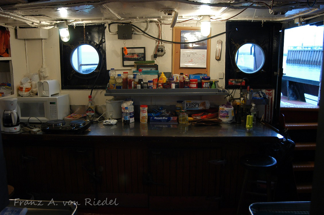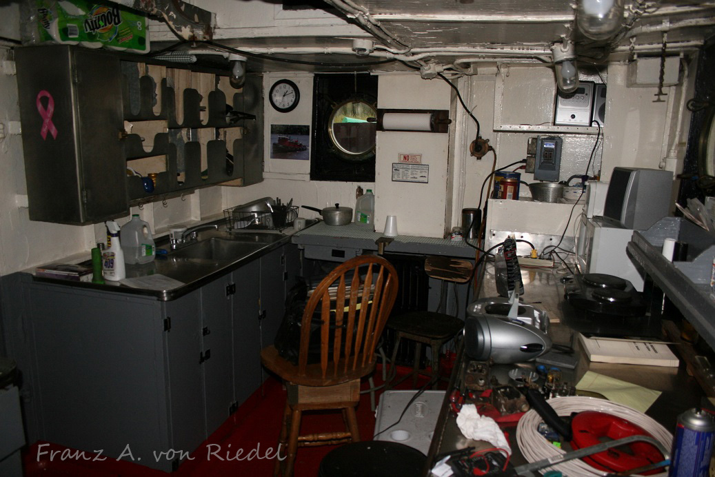 Lets take a quick walk through the Sharon Elizabeth, starting in the stern. I always wondered the reasoning behind the stepped deckhouse design. Entering in from the door, you head down a few steps into the galley, complete with giant cast iron Webb diesel stove that every tug and ship of the era had. Click for larger. Photos courtesy of Franz A. von Riedel.