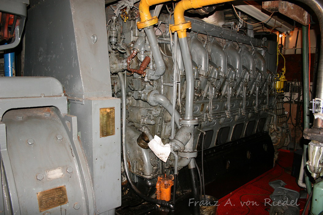 The Sharon had her twin 8-567 engines replaced in 1956 with a single Cleveland 12-278A removed from a Patrol Craft. An Allis-Chalmers main generator was utilized from a Destroyer-Escort, a common package used in Diesel-Electric tugs of the era. Click for larger. Photos courtesy of Franz A. von Riedel.
