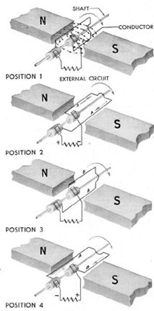 In Fig 1 -Position 1, a loop of wire is set between the poles of a North and South magnet. The loop is connected by sliprings and brushes to the external circuit.