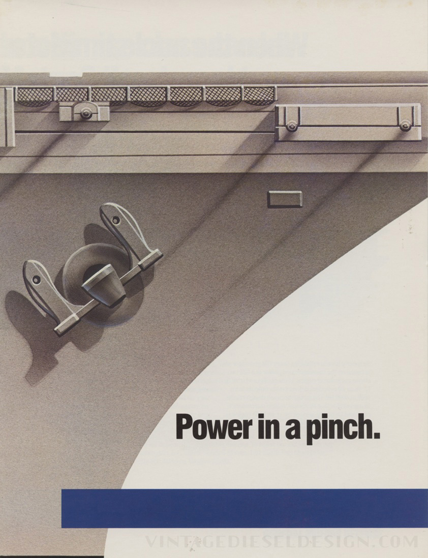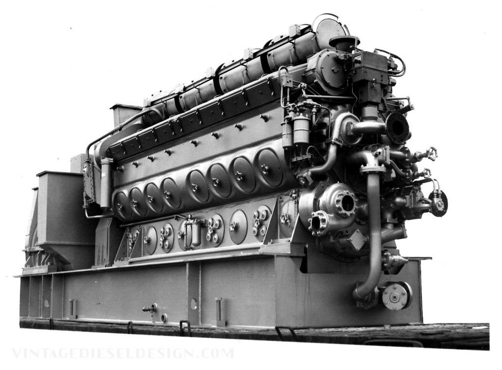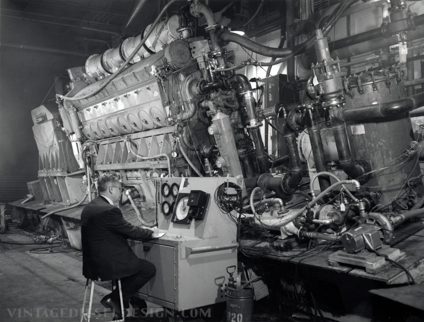 In order to do this, EMD made a gigantic, movable test stand! The engines needed to be tested in overload situations and at various angles to mimic conditions out in the ocean, as well as shock loading in case of battle conditions. In the photo above, an EMD engineer is as work testing one of these engines with it leaned over to the side.