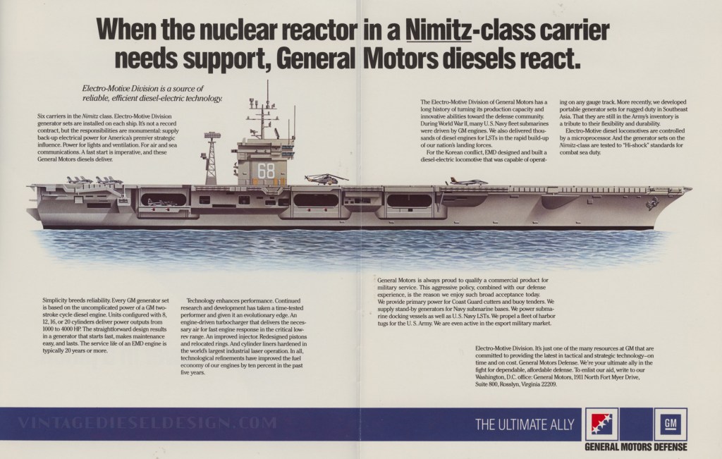 Its worth noting the previous three carriers, Enterprise (CVN-65), America (CV-66) and John F. Kennedy (CV-67) also had EMD generators. Each ship had 16-567C engines with 1000kW generators: Enterprise had 4, the others had 3 each. The engines in the Enterprise were ordered and shipped under Cleveland Diesel, one of their last large projects before being absorbed into EMD.