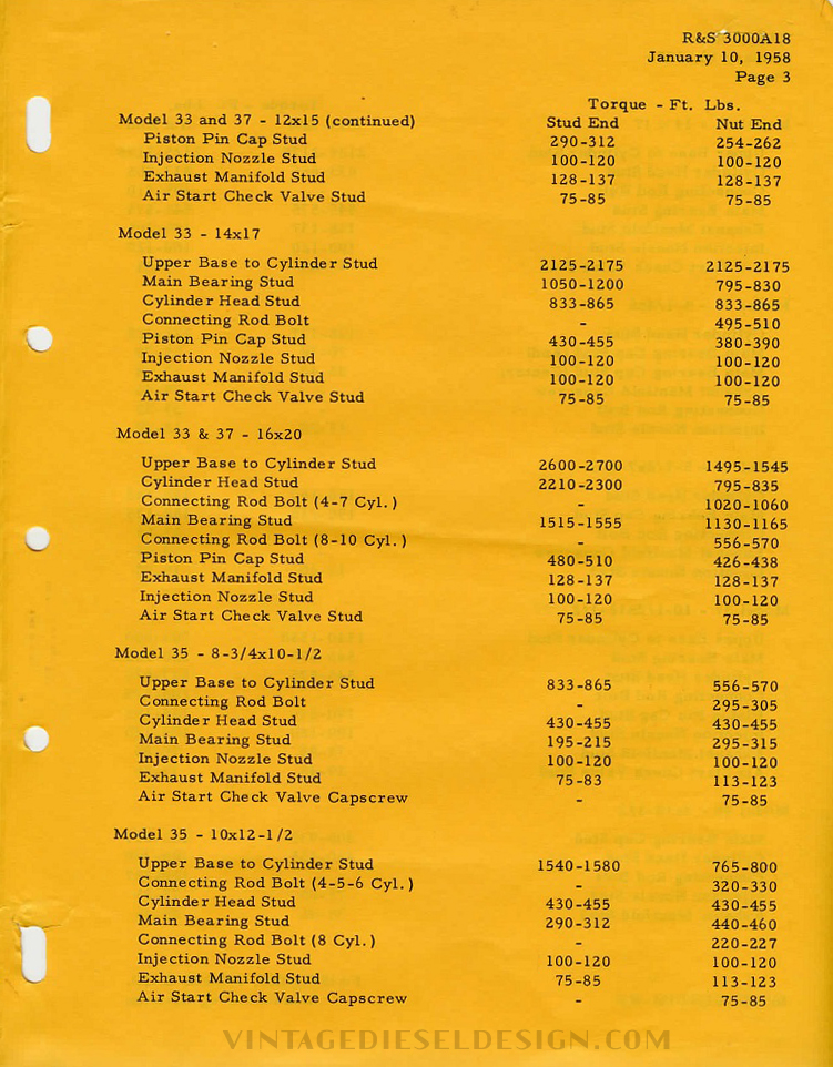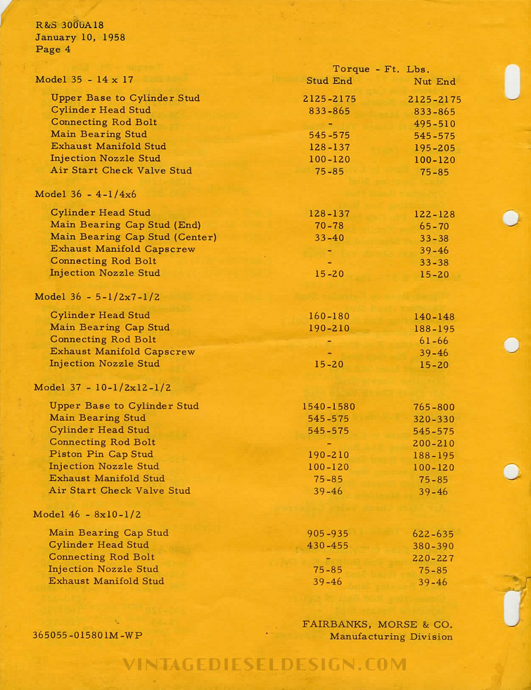 We get a fair amount of emails here asking for help with specific engines and certain specs – such as torque values. This winter we got an email asking about head bolt torque on the FM 32E14 engine, as there is not one single torque spec in the manual (all 3 versions I have, zilch..). This was actually pretty common for older engines. I have seen such things as “1 man on a 3′ bar” sort of specs in some older engine books! Well, as it turns out, I was browsing through a binder of FM bulletins I have, one of which was a sheet for torque specs for all the FM diesels (pre OP)! So, here it is..