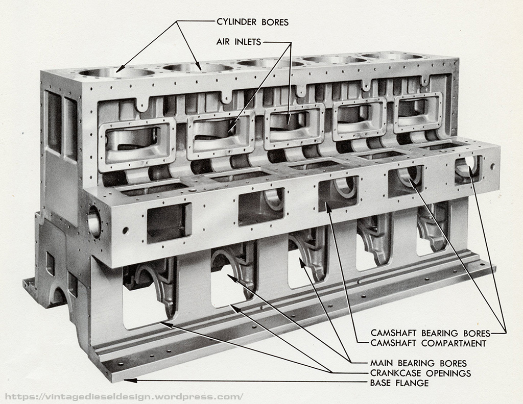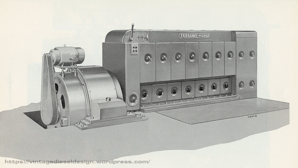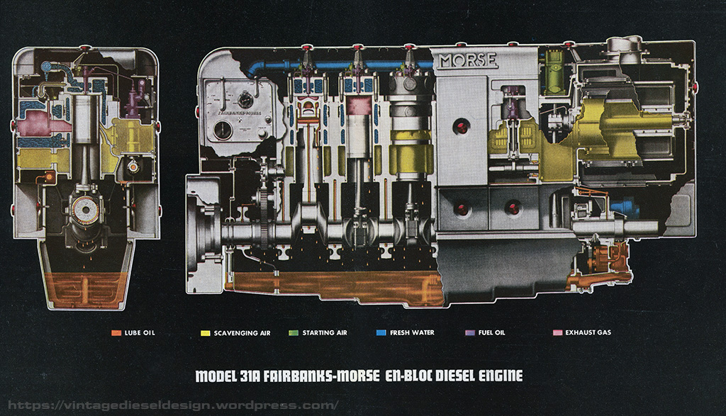 As we outlined in our very first post here, Fairbanks-Morse introduced a line of what they called “En bloc” engines, meaning whole, which to put bluntly, they used a one piece cast crankcase with integrated cam pocket and bearing bores, which F-M advertised as putting all of the pieces in perfect alignment every time. Attached to the block would be the various auxiliary pumps, exhaust belt, water header, blower, etc.