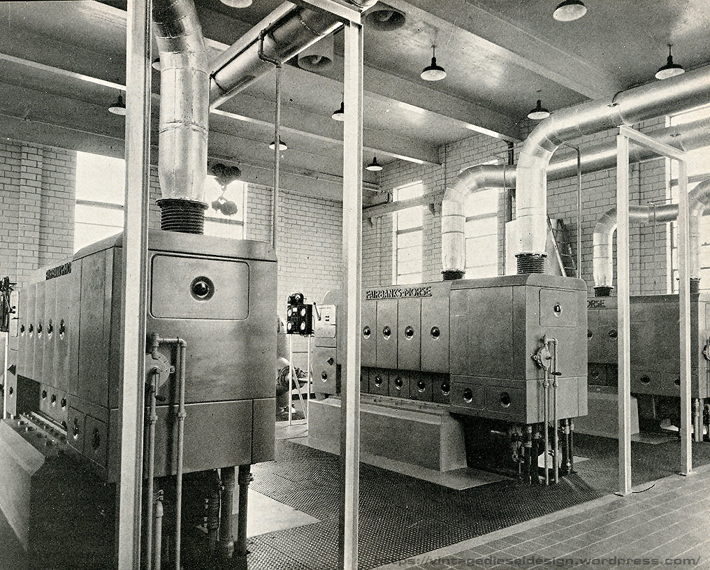 An FM 5 Cylinder 31A8 ½“ driving a 75,000gpm pump at the Corpus Christi flood control station “B”. Fairbanks-Morse News. Click for larger.