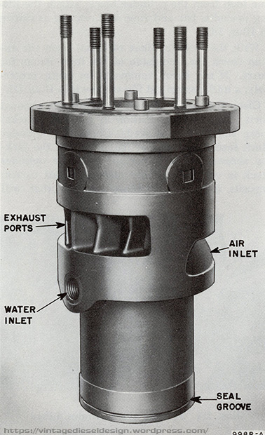 Unlike most previous large F-M engines which the cylinder liner sits on top of the main crankcase, the 31A uses a cylinder liner that inserts into the block. The air inlet ports, and the exhaust ports are surrounded by a water jacket supplied through an unorthodox method. Cooling water enters the engine into the (water jacketed) exhaust manifold. A threaded fitting allows water to exit from the exhaust jacket, into the lower portion of the liner, flowing up through the head into a water header. On the bottom of the liner was a simple O ring to seal the scavenging air from the crankcase.