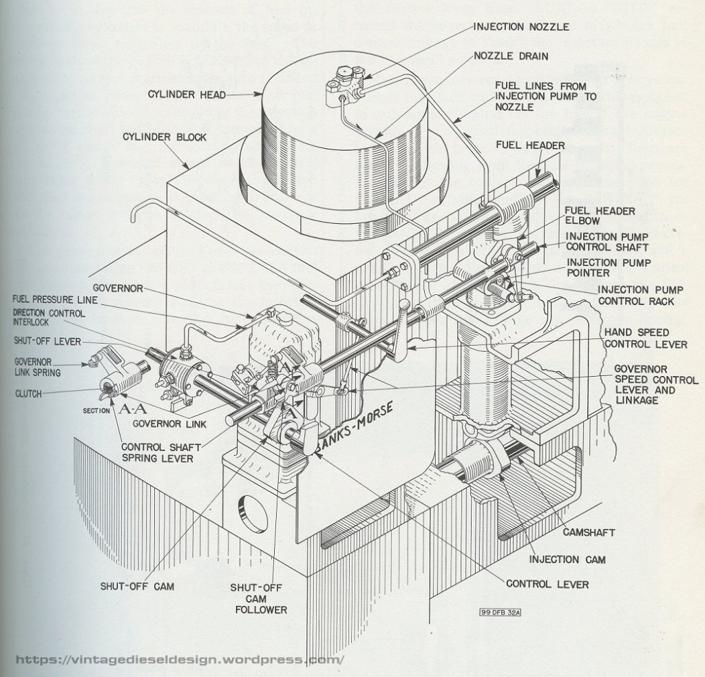 Under the hood on the control end, things are a little more complicated. To maintain the streamlined appearance, all the control rods are inside. Follow the diagram – Incoming fuel comes into the fuel header on top of the injection pumps. Each injection pump is driven off the camshaft. The fuel rack on the pumps is controlled by the governor – in this case, a direct reversing marine engine, using a Woodward SG8 governor. Governor speed is controlled by a speed lever. The governor is driven off the camshaft, which also drives the fuel pump, as well as a very basic, mechanical overspeed governor trip system. Engine direction is controlled by a separate lever, which controls an interlock on the air side (to prevent the engine from starting if it is still moving in the opposite direction).