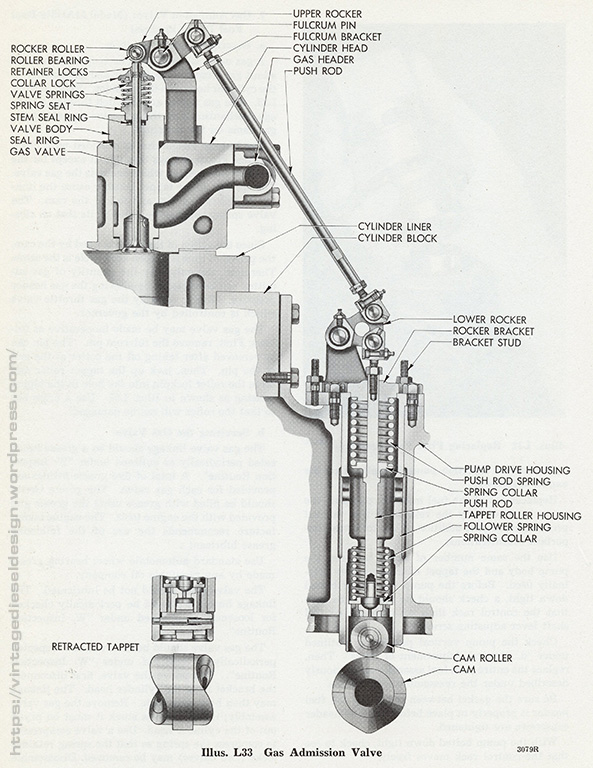 In the case of the 31A8 ½“ engine, an optional dual fuel version was offered, the 31AD8 ½“. While the specifications are the same, the AD engine included a few additional parts in order to run on both Diesel and Natural Gas – however, Diesel was still used as a pilot fuel. On the control side of the AD engine, tied into the control lever is a pilot valve, which controls an oil pressure activated gas shut off valve – which is also tied into the governor overspeed – thus, if the engine overspeed’s, or shuts down for any reason, the natural gas is shut off. On top of the engine, a gas manifold runs alongside the cylinder heads. On each of the cylinder heads is a valve, which is operated by a set of push rods and rockers off the main cam shaft. The fuel injection pumps are a duplex style, that when the engine is run in Diesel mode, the normal amount of fuel is injected, however when operating in dual fuel mode, a smaller metered amount of Diesel is injected as a pilot fuel for the Natural Gas. When running in Diesel mode, the gas injection valves are still functioning, however nothing happens as they open when the exhaust stroke starts.