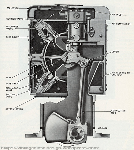 Scavenging air for the 31A series is provided by an attached vane style, oscillating blower. In layman’s terms, it’s a big moving flap. Incoming air comes in through a set of intake valves, gets compressed (1.5-3psi), and exits into the airbox through a set of discharge valves. The moving vane is run off its own connecting rod on the forward end of the engine. Intake air could be routed through the top, or front of the engine. Engines so equipped with a compressor; this was driven off the lever that runs the blower vane.