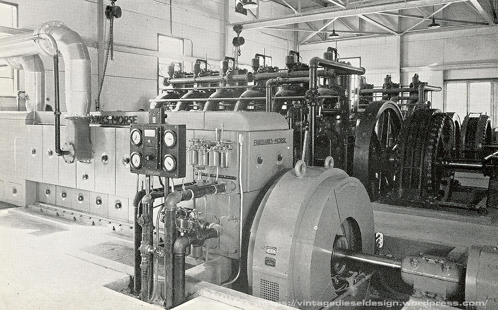 A trio of FM 6 cylinder 31AD8 ½“ engines at the Roodhouse, IL municipal power plant. The AD version of the engine can be spotted by having the extra set of duplex filters (the Diesel version only has one set). These engines each drive a 265kW alternator. Fairbanks -Morse News. Click for larger.