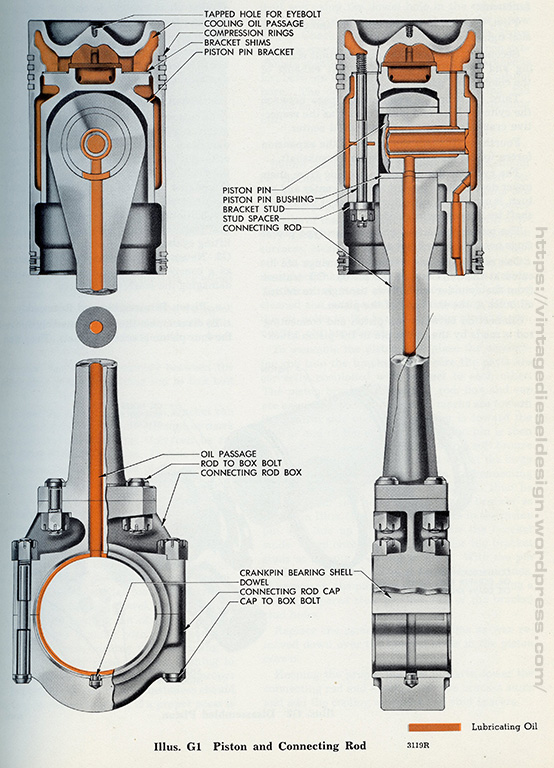 The 31A piston used a set of bolts to hold the carrier to the piston. On the lower end, like all of the previous large bore FM engines, the crank pin bearings were in their own separate holder, thus when you had to pull a piston, you did not have to detach it from the crankshaft. FM Photo – Click for larger.