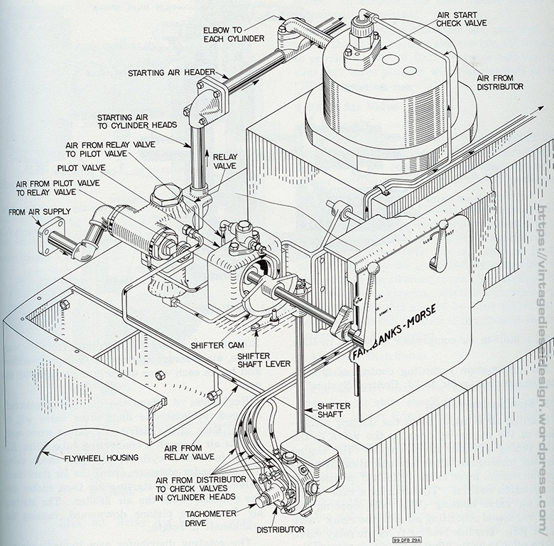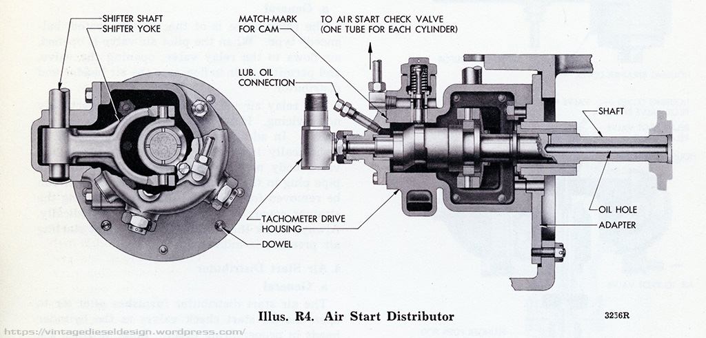 Moving on to the air system: The shift lever controls a rather complex pilot air system. Driven off the camshaft gear drive train, is an air distributor. Think of this like a distributer in a car. Instead of controlling the firing order of spark plugs, it controls the air start sequence timing. Putting the lever to start, air from the pilot valve, opens the air start relay valve, thus filling air header with start air. At the same time, air from the distributor. opens a check valve on the appropriate cylinder, thus letting the start air in. The same lever also has a cam that is tied into the fuel rack and governor, to set the fuel load when either in the start or run position. In order to switch from ahead to astern, the shifter lever also controls a shifter cam, which in turn runs down to a shift fork inside the air start distributor. This shifter moves a small camshaft to choose the appropriate timing for ahead or astern starting.