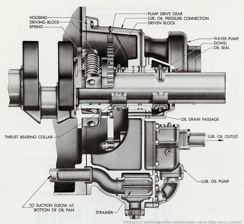 Unlike the larger 31A18 engine, these smaller engines have more provisions for attached pumps. All the pumps (oil, raw water, soft water) are driven off the crankshaft through a flexible drive gear (a spring pack drives the gear to absorb any shocks) located under the blower. In the case of the direct reversing engines, all the pumps are reversable (except the fuel pump, which has a directional switching valve). One of the options for marine engines was a small reciprocating bilge pump that was driven off an eccentric on the cam idler gear. Behind the flexible drive gear was the thrust bearing. Often in cases of stationary engines, water pumps were typically electric driven pumps.
