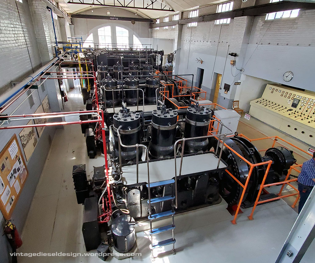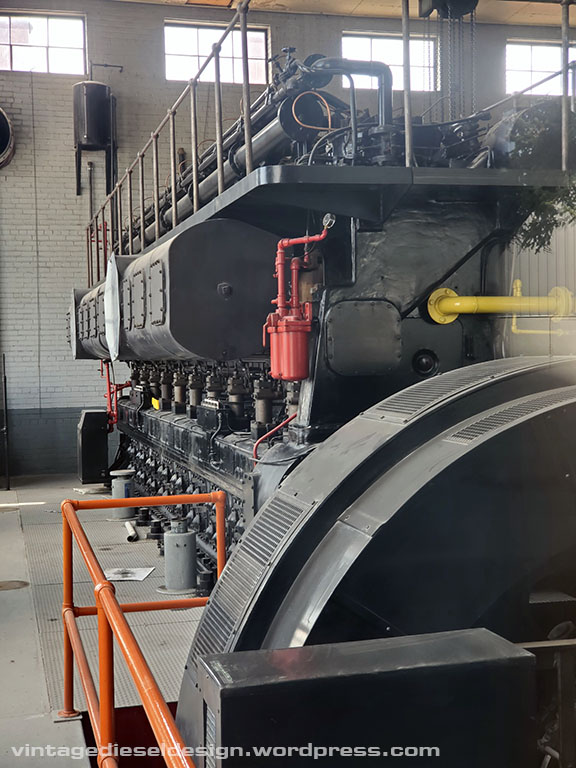 Just outside of the engine hall, is a small clean air room. Inside, is the scavenging air blower for the engine (all 10 cylinder engines used an external blower) – a Roots-Connersville 24″ centrifugal blower. The blower, is rated at a whopping 300HP and moves 17,500CFM of air.