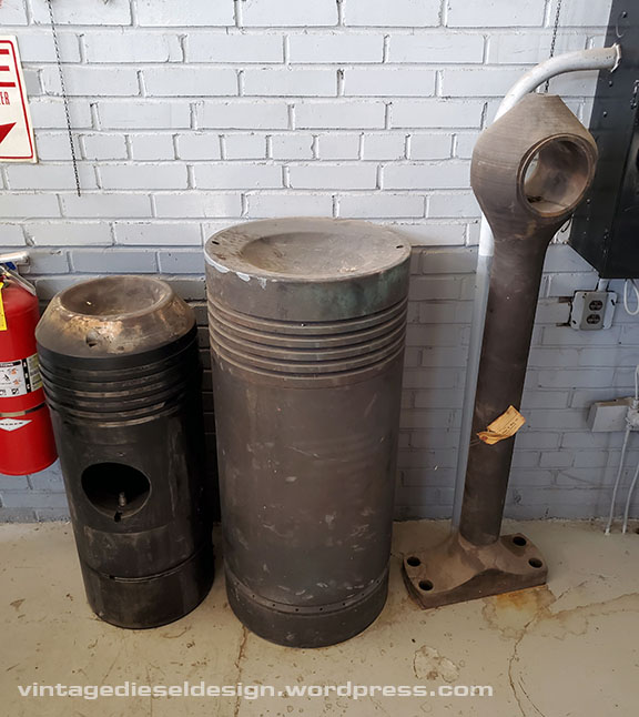 Up on top, the 31A used a very basic lump of a cylinder head, like most of the previous F-M engines. A central fuel injection nozzle, along with a start air check valve, and a space for either a test cock or a start cartridge adaptor. The cylinder heads bolt down onto the liners, with a simple copper gasket between the firing surfaces, and rubber rings on the water passages.