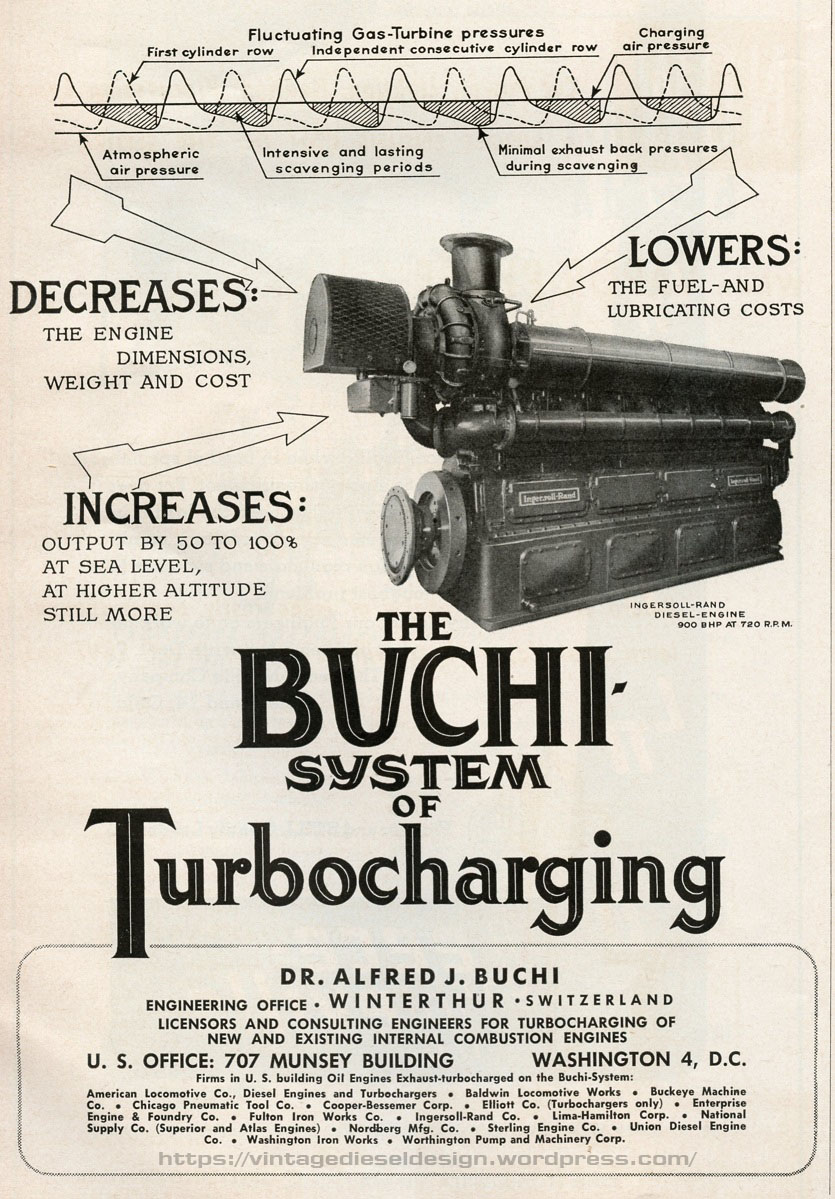 Dr. Alfred Büchi, a Swiss engineer, was the father of Turbocharging as we know it. Buchi went on to license his designs to numerous American (and Foreign) engine companies, many of which are listed in the 1951 advertisement above. A note – these were vastly all 4 stroke engine designs. It was not until the 1950s when Turbocharging on 2 strokes was perfected.
