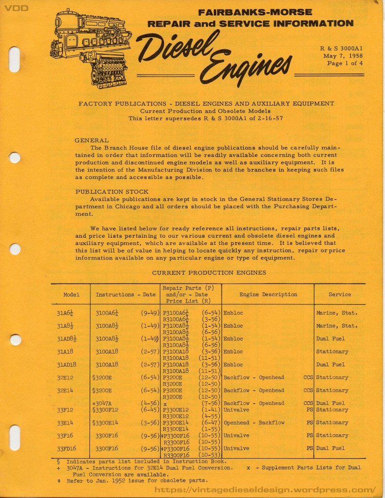 The F-M 31A En bloc engine seems to have made its first appearances in advertising around 1945. This specific line of 31A appears to be the decedent to the 31A “Borneo” engine. The first real production of this 31A series seem to start around 1949, which is the publication dates of each of my manuals. The 31A was offered in 3 bore sizes: 6 ¼”, 8 ½” and 18”.