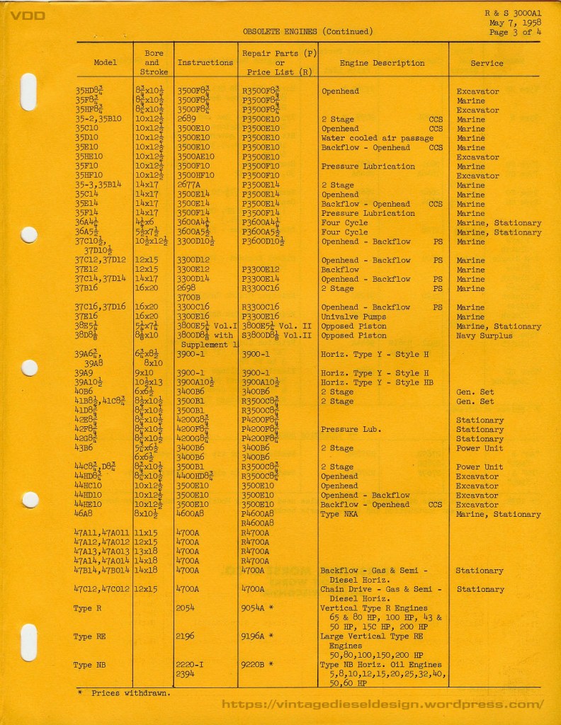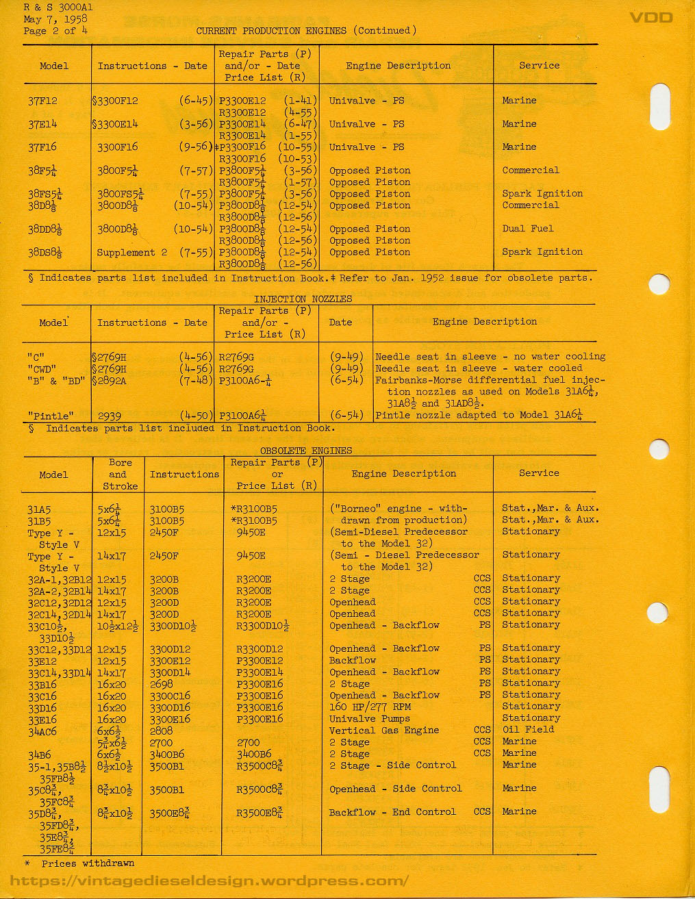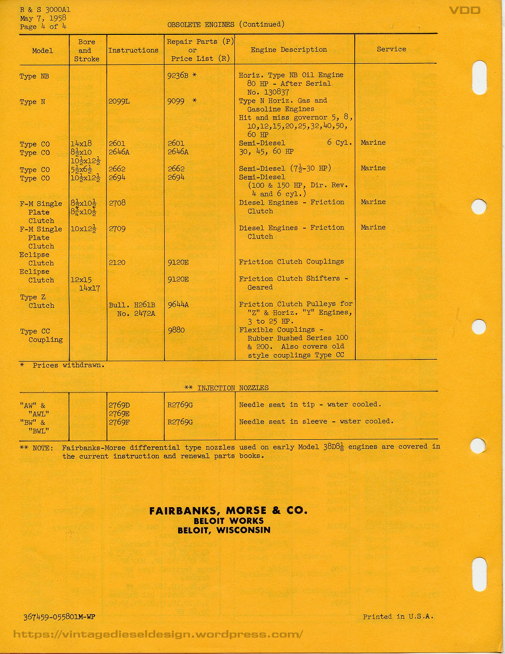 The F-M 31A series (with the exception being the 18” bore for stationary power generation) never really caught on. By the 1950’s when F-M was really pushing the engines, there was already smaller and lighter engines making around the same power. Not to mention, the plethora of cheap WWII surplus engines, including many F-M 38D OP’s which went on to do just about every job under the sun. By 1958, F-M severely reduced engine production to just the 38D OP engines (in both bore sizes), the 31A18, and the small 45C and 49B engines. All of the older models were now discontinued (such as the 31A, 32D, 37F, 33D: any of the older pump or crankcase scavenged engines). One of (the?) last running example of a 31A8 ½” was the NOAA research vessel “John N. Cobb”, which was operational until 2008 when the crank snapped. The vessel has recently been sold for use as a fishing boat, and I would imagine will be repowered. The small, former Canadian buoy tender “Nokomis” has a 31A6 ¼” and has been up for grabs for some time now, if it has not been scrapped yet. I imagine there may still be a handful of older stationary examples hiding around the country somewhere. W.W. Williams became the parts supply company for these engines when F-M gave up the rights, however nothing has been available for quite some time. Interestingly enough, Williams listed a 4 3/8” as well as a 10 ½” bore 31Aengine, however I have seen nothing about this in any of my F-M company literature, production lists or any advertising of the period.