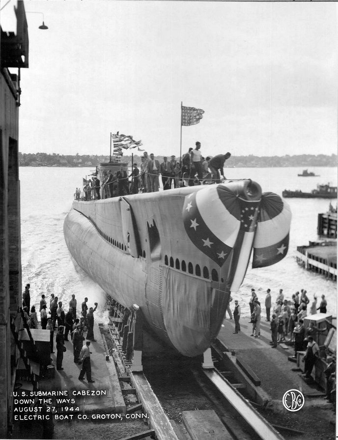 Launching of the fleet sub “Cabezon” at Electric Boat. USN photo # 80-G-448206 from National Archives and Records Administration (NARA), College Park, Maryland, courtesy of Sean Hert via Navsouce.org. Click for Larger.