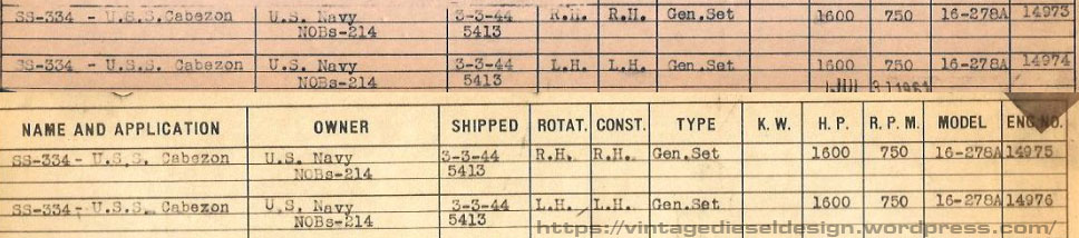 Order sheets for the 4 main engines in the sub “Cabezon”, part of navy order NOBs 214/CDED 5413. J.S. Boggess Collection. Click for larger.Cleveland 16-278A located in the sub “Becuna”, SS-319. “Becuna” is one of the sisters of “Cabezon”. Click for larger.