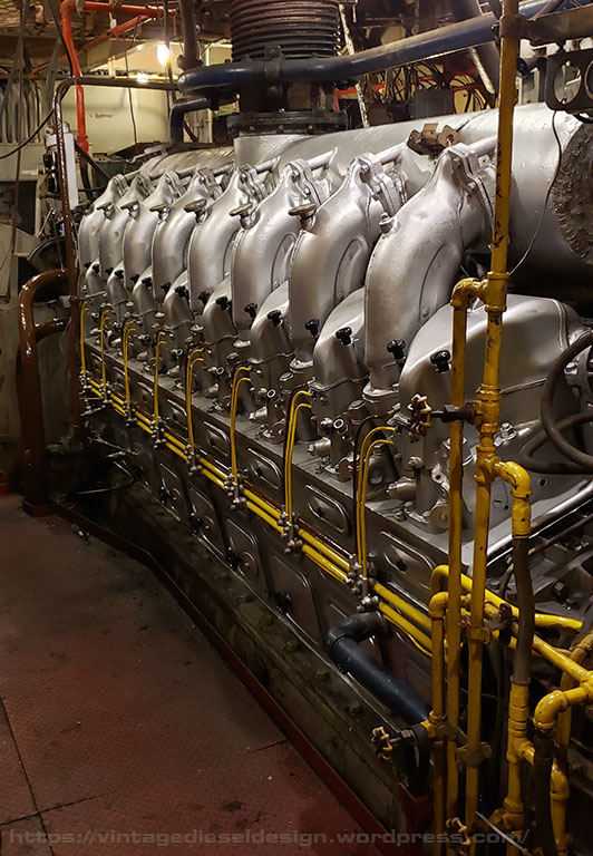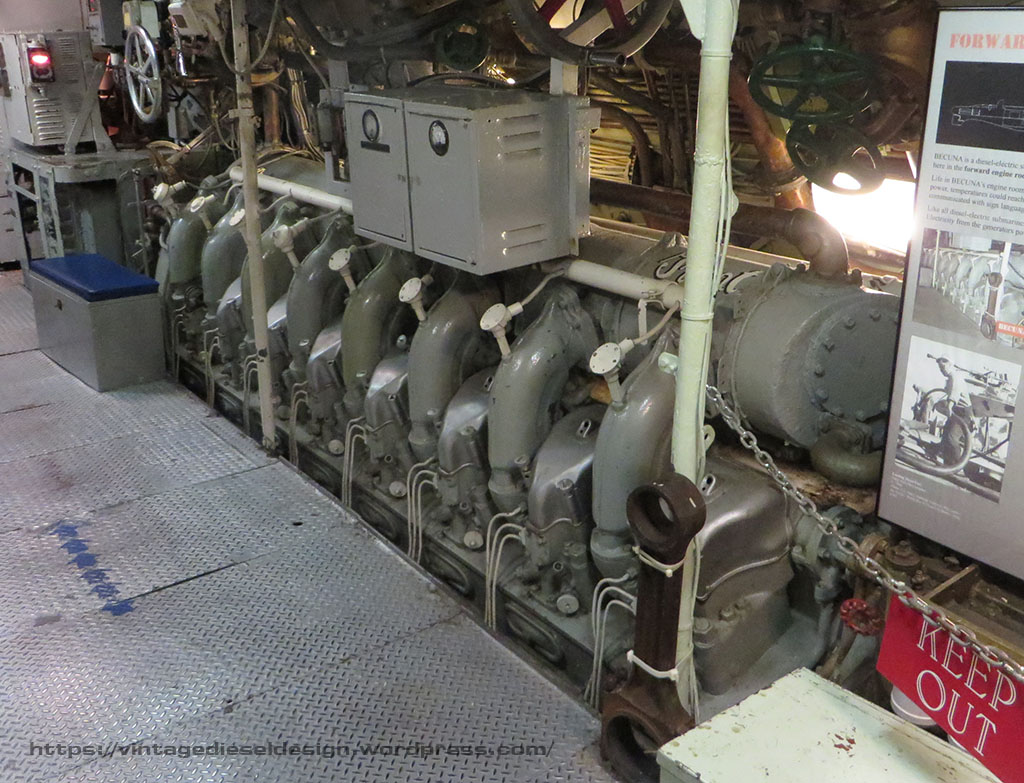 How the engine appeared out of the factory for the subs. Note it looks like the valve covers are actually polished! When put in the tug, the governor’s were switched over to Marquette’s, as well as the lay shaft arrangement to the more traditional, chest height one. Click for larger.